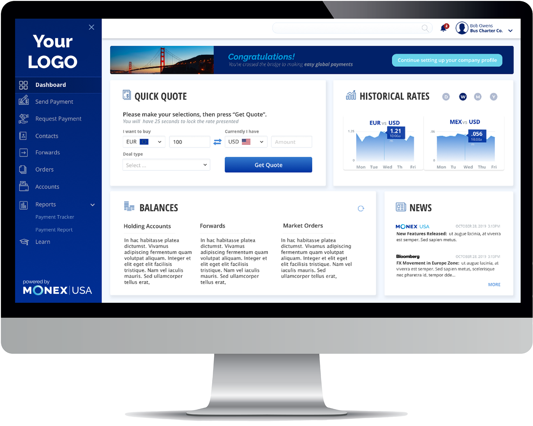 Co-branding our online payment and reporting platform allows you to manage all aspects of your Monex USA relationship from anywhere. Whether you make supplier payments, check holding account balances, add or update beneficiaries, or request a monthly transaction report, our 24/7 trading platform allows clients to do so easily and securely.