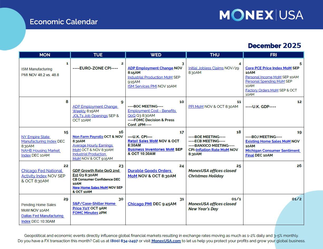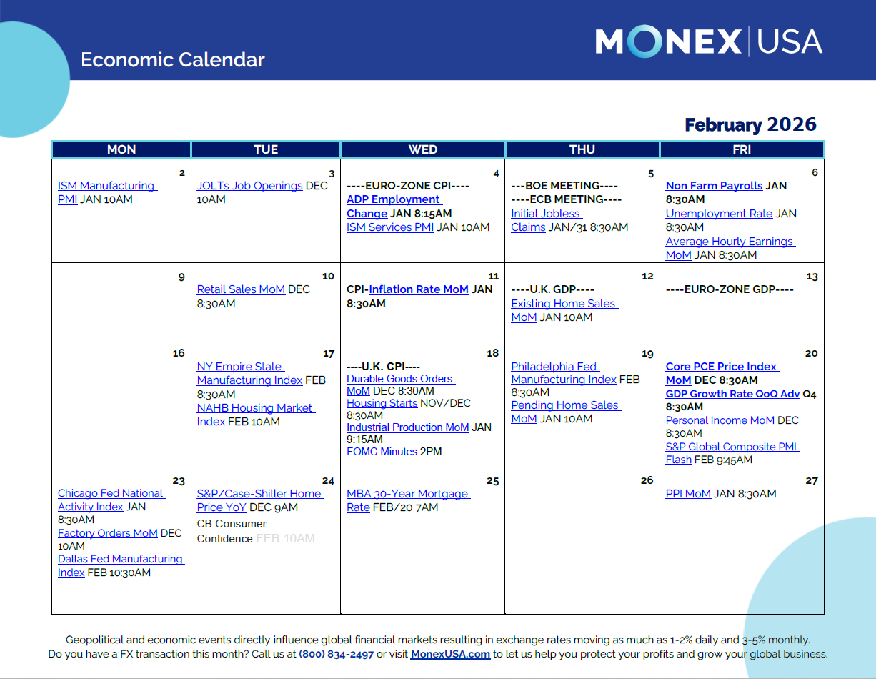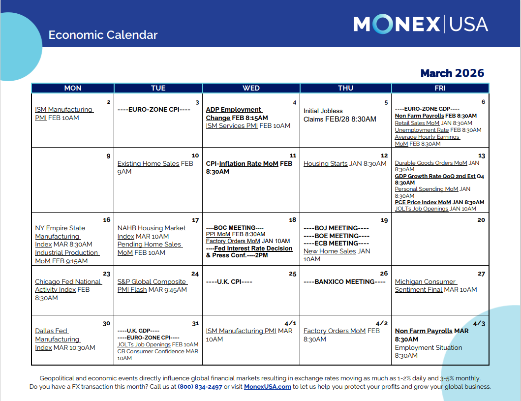 Follow this month's key economic events, announcements, and news that affect the Forex market to better manage your international transactions. View this month's economic calendar here!